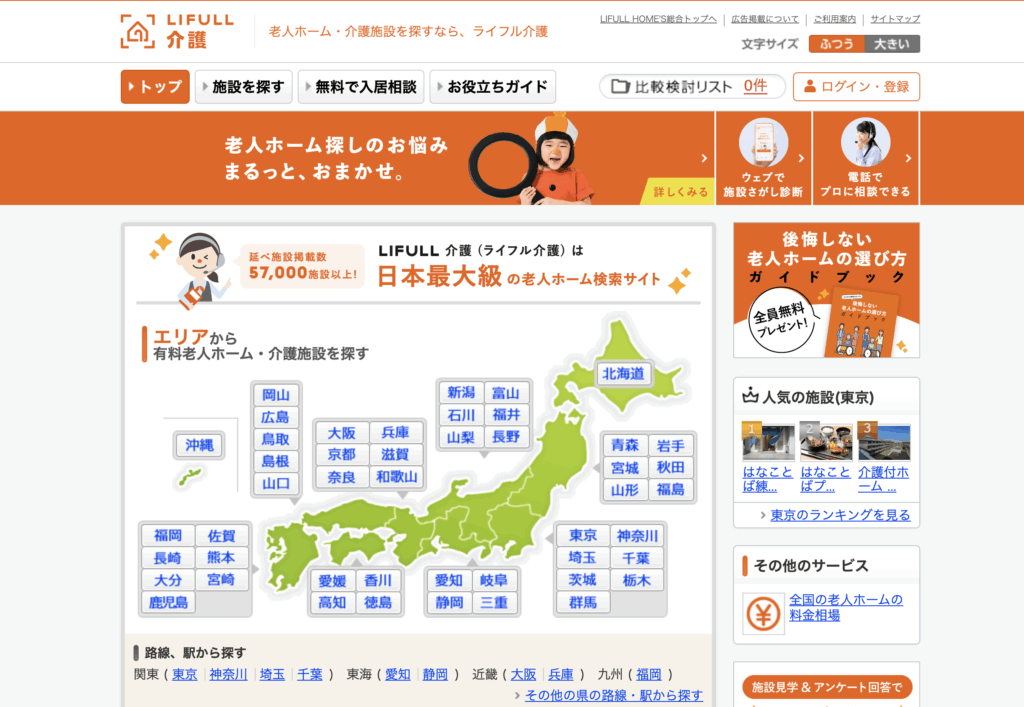 LIFULL介護は、東証プライム上場のLIFULLグループに属する「LIFULL senior(ライフルシニア)」が運営する、全国対応の老人ホーム・介護施設検索サイトです。首都圏を中心に57,000件を超える施設情報を取り扱っています。